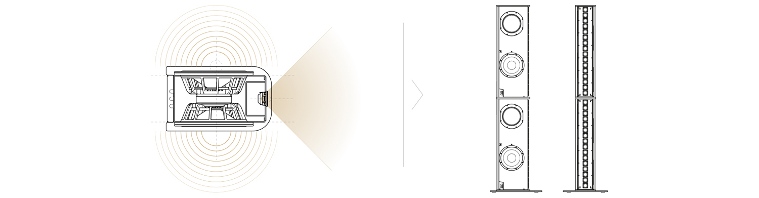 The system features line array elements each with 16 x 2" woofers, paired with 2 x 10" woofers for deep bass, and enhanced by a passive radiator in every module - with the result of a complete full-range tower speaker.